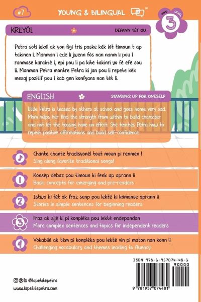 ENGLISH Little Petra is teased by others at school and goes home very sad. Mom helps her find the strength from within to build character and not let the teasing have an effect. She teaches Petra how to repeat positive affirmations and build self-confidence. KREYÒL Petra soti lekòl ak yon figi tris paske kèk lòt timoun t ap takinen l. Manman l ede li jwenn fòs nan nanm li pou l ranmase karaktè l, epi pou li pa kite takinri yo fè efè sou li. Manman Petra montre Petra ki jan pou li repete kèk mesaj pozitif pou l kab gen konfyans nan tèt li.