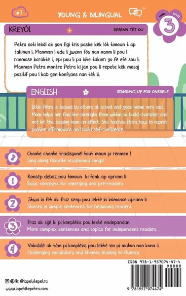 ENGLISH Little Petra is teased by others at school and goes home very sad. Mom helps her find the strength from within to build character and not let the teasing have an effect. She teaches Petra how to repeat positive affirmations and build self-confidence. KREYÒL Petra soti lekòl ak yon figi tris paske kèk lòt timoun t ap takinen l. Manman l ede li jwenn fòs nan nanm li pou l ranmase karaktè l, epi pou li pa kite takinri yo fè efè sou li. Manman Petra montre Petra ki jan pou li repete kèk mesaj pozitif pou l kab gen konfyans nan tèt li.