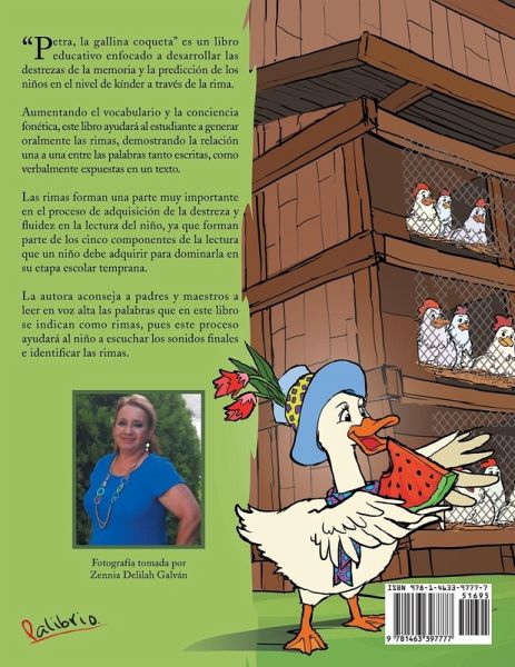 "Petra, la gallina coqueta" es un libro educativo enfocado a desarrollar las destrezas de la memoria y la predicción de los niños en el nivel de kínder a través de la rima. Aumentando el vocabulario y la conciencia fonética, este libro ayudará al estudiante a generar oralmente las rimas, demostrando la relación una a una entre las palabras tanto escritas, como verbalmente expuestas en un texto. Las rimas forman una parte muy importante en el proceso de adquisición de la destreza y fluidez en la lectura del niño, ya que forman parte de los cinco componentes de la lectura que un niño debe adquirir para dominarla en su etapa escolar temprana. La autora aconseja a padres y maestros a leer en voz alta las palabras que en este libro se indican como rimas, pues este proceso ayudará al niño a escuchar los sonidos finales e identificar las rimas.