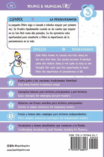 ENGLISH Little Petra travels to Canada and tries skiing for the very first time. She quickly becomes frustrated when she realizes skiing is not quite as easy as she thought. Her aunt uses this opportunity to teach Petra the importance of perseverance in life. ESPAÑOL La pequeña Petra viaja a Canadá e intenta esquiar por primera vez. Se frustra rápidamente cuando se da cuenta que esquiar no es tan fácil como ella pensaba. Su tía aprovecha esta oportunidad para enseñarle a Petra la importancia de la perseverancia en la vida.