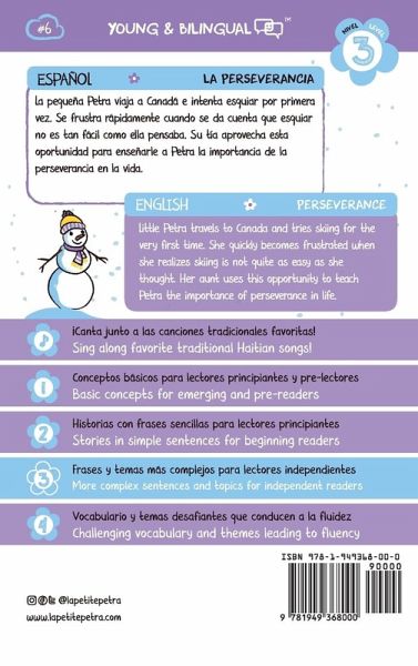 ENGLISH Little Petra travels to Canada and tries skiing for the very first time. She quickly becomes frustrated when she realizes skiing is not quite as easy as she thought. Her aunt uses this opportunity to teach Petra the importance of perseverance in life. ESPAÑOL La pequeña Petra viaja a Canadá e intenta esquiar por primera vez. Se frustra rápidamente cuando se da cuenta que esquiar no es tan fácil como ella pensaba. Su tía aprovecha esta oportunidad para enseñarle a Petra la importancia de la perseverancia en la vida.