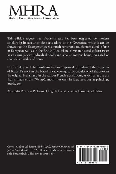 Winner of the 2021 Associazione Italiana di Anglistica book prize for a critical edition in the field of English literature. This edition argues that Petrarch's text has been neglected by modern scholarship in favour of the translations of the Canzoniere, while it can be shown that the Triumphi enjoyed a much earlier and much more durable fame in Europe as well as in the British Isles, being translated at least twice in its entirety, with individual books and smaller sections being translated or adapted a number of times. Critical editions of the translations are accompanied by analysis of the reception of Petrarch's work in the British Isles, looking at the circulation of the book in the original Italian and in the various French translations, as well as at the use that is made of the Triumphi motifs not only in literature, but in paintings, music, etc.