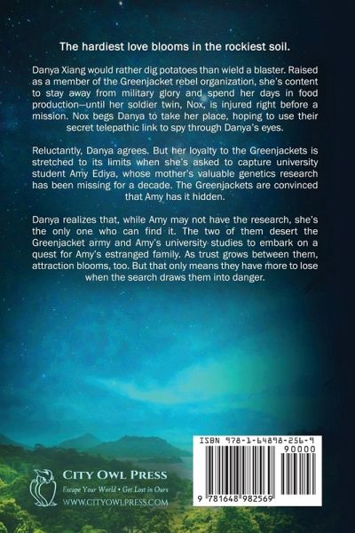 Twenty-two-year-old Danya Xiang would rather dig potatoes than wield a blaster. Unfortunately, that’s not an option; she was born into the Greenjackets, a militaristic rebel organization dedicated to fighting the oppressive Empire. Her twin sister, Nox, is a talented soldier, while Danya makes do with a career in food production. That is, until Nox begs Danya to take her place in an offworld expedition. Danya reluctantly agrees, hoping the mission will be over before anyone notices the twins swapping places. The mission? To capture university student Amy Ediya, whose mother’s valuable genetics research has gone missing. The Greenjackets are convinced that Amy has it hidden, and are ready to torture it out of her. Amy doesn’t have the research, but she knows where to find it. Pirates, giant fish aliens, and Danya’s angry twin all stand in their way, but Danya and Amy make a great team…especially once they catch a bad case of feelings for each other. But the closer they get to their goal, the more apparent it becomes that the missing information might be hiding secrets that endanger both of them.