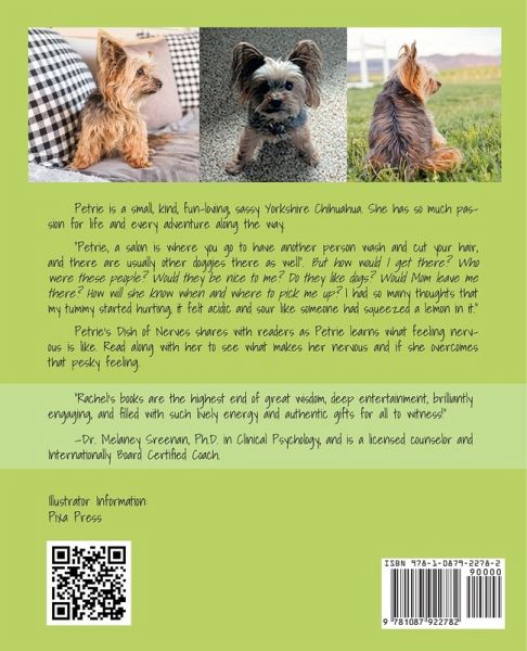 Petrie is a small, kind, fun-loving, sassy Yorkshire Chihuahua. She has so much passion for life and every adventure along the way. "Petrie, a salon is where you go to have another person wash and cut your hair, and there are usually other doggies there as well". But how would I get there? Who were these people? Would they be nice to me? Do they like dogs? Would Mom leave me there? How will she know when and where to pick me up? I had so many thoughts that my tummy started hurting; it felt acidic and sour like someone had squeezed a lemon in it." Petrie's Dish of Nerves shares with readers as Petrie learns what feeling nervous is like; read along with her to see what makes her nervous and if she overcomes that pesky feeling.