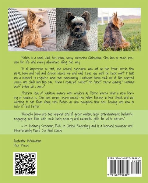 Petrie is a small, kind, fun-loving, sassy Yorkshire Chihuahua. She has so much passion for life and every adventure along the way. "It all happened so fast; one second, everyone was sat on the front porch; the next, Mom and Dad and Gracie kissed me and said, "Love you, we'll be back soon!" It took me a moment to register what was happening. I watched them walk out of the covered porch and climb into the car. Then I realized: What? Be back? You're leaving? Without me!? What did I miss?" Petrie's Dish of Sadness shares with readers as Petrie learns what a new feeling of sadness is. She has never experienced the hollow feeling in her chest, and not wanting to eat. Read along with Petrie as she navigates this new feeling and how to help it feel better.