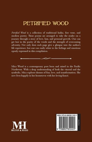 Petrified Wood is a collection of traditional haiku, free verse, and modern poetry. These poems are arranged to take the reader on a journey through a story of love, loss, and personal growth. One can get lost in the purity of the words and the strength of overcoming adversity. Not only does each page give a glimpse into the author's life experience, but one can easily relate to the feelings and emotions openly expressed in this compilation.