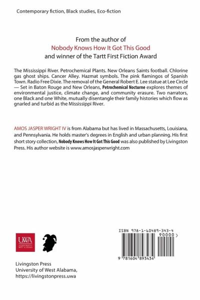 "The Mississippi River. Petrochemical plants. New Orleans Saints football. Chlorine gas ghost ships. Cancer Alley. Hazmat symbols. The pink flamingos of Spanish Town. Radio Free Dixie. The removal of the General Robert E. Lee statue at Lee Circle - Set in Baton Rouge and New Orleans, Petrochemical Nocturne explores themes of environmental justice, climate change, and community erasure. Two narrators, one Black and one White, mutually disentangle their family histories which flow as gnarled and turbid as the Mississippi River"--