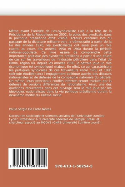 Même avant l''arrivée de l''ex-syndicaliste Lula à la tête de la Présidence de la République en 2002, le poids des syndicats dans la politique brésilienne était visible. Acteurs centraux lors du passage de la dictature militaire vers la démocratie à partir de la fin des années 1970, les syndicalistes ont aussi joué un rôle capital au cours des années 1950 et 1960 durant la période national-populiste. Ce livre essaie de comprendre cette importance politique des syndicats brésiliens à partir d''une étude de cas sur les travailleurs de l''industrie pétrolière dans l''état de Bahia, région où, depuis les années 1950, le pétrole joue un rôle économique (et symbolique) majeur. En effet, ce qui caractérisera les pratiques syndicales de ces travailleurs entre 1950 et 1995 (période étudiée),sera l''engagement politique auprès des discours nationalistes et de défense de la compagnie nationale du pétrole. De même, leurs principaux conflits internes seront traduits par la défense de versions différentes du nationalisme. Ainsi, une des questions récurrentes dans cet ouvrage sera le rôle joué par les idéologies nationalistes dans la vie politique brésilienne durant la deuxième moitié du XXème siècle.