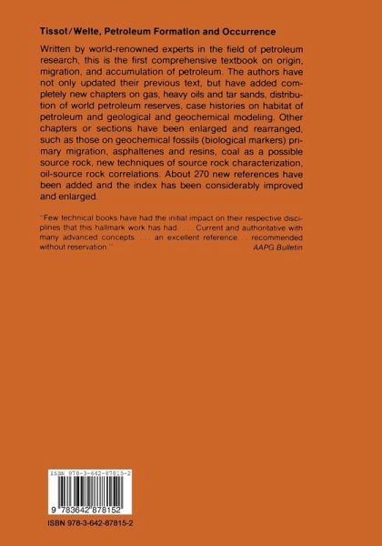 Production and Accumulation of Organic Matter: A Geological Perspective.- Production and Accumulation of Organic Matter The Organic Carbon Cycle.- Evolution of the Biosphere.- Biological Productivity of Modern Aquatic Environments.- Chemical Composition of the Biomass: Bacteria, Phytoplankton, Zooplankton, Higher Plants.- Sedimentary Processes and the Accumulation of Organic Matter.- The Fate of Organic Matter in Sedimentary Basins: Generation of Oil and Gas.- Diagenesis, Catagenesis and Metagenesis of Organic Matter.- Early Transformation of Organic Matter: The Diagenetic Pathway from Organisms to Geochemical Fossils and Kerogen.- Geochemical Fossils and Their Significance in Petroleum Formation.- Kerogen: Composition and Classification.- From Kerogen to Petroleum.- Formation of Gas.- Formation of Petroleum in Relation to Geological Processes. Timing of Oil and Gas Generation.- Coal and its Relation to Oil and Gas.- Oil Shales: A Kerogen-Rich Sediment with Potential Economic Value.- The Migration and Accumulation of Oil and Gas.- An Introduction to Migration and Accumulation of Oil and Gas.- Physicochemical Aspects of Primary Migration.- Geological and Geochemical Aspects of Primary Migration.- Secondary Migration and Accumulation.- Reservoir Rocks and Traps, the Sites of Oil and Gas Pools.- The Composition and Classification of Crude Oils and the Influence of Geological Factors.- Composition of Crude Oils.- Classification of Crude Oils.- Geochemical Fossils in Crude Oils and Sediments as Indicators of Depositional Environment and Geological History.- Geological Control of Petroleum Type.- Petroleum Alteration.- Heavy Oils and Tar Sands.- Oil and Gas Exploration: Application of the Principles of Petroleum Generation and Migration.- Identification of Source Rocks.- Oiland Source Rock Correlation.- Locating Petroleum Prospects: Application of Principle of Petroleum Generation and Migration - Geological Modeling.- Geochemical Modeling: A Quantitative Approach to the Evaluation of Oil and Gas Prospects.- Habitat of Petroleum.- The Distribution of World Oil and Gas Reserves and Geological-Geochemical Implications.