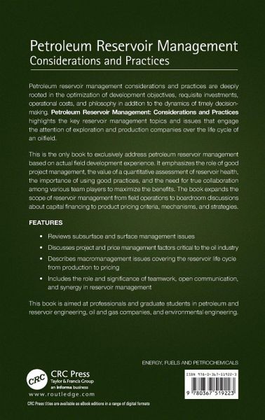 Petroleum reservoir management considerations and practices are deeply rooted in the optimization of development objectives, requisite investments, operational costs, and philosophy in addition to the dynamics of timely decision-making. Petroleum Reservoir Management: Considerations and Practices highlights the key reservoir management topics and issues that engage the attention of exploration and production companies over the life cycle of an oilfield. This is the only book to exclusively address petroleum reservoir management based on actual field development experience. It emphasizes the role of good project management, the value of a quantitative assessment of reservoir health, the importance of using good practices, and the need for true collaboration among various team players to maximize the benefits. The book expands the scope of reservoir management from field operations to boardroom discussions about capital financing to product pricing criteria, mechanisms, and strategies. FEATURES Reviews subsurface and surface management issues Discusses project and price management factors critical to the oil industry Describes macromanagement issues covering the reservoir life cycle from production to pricing Includes the role and significance of teamwork, open communication, and synergy in reservoir management This book is aimed at professionals and graduate students in petroleum and reservoir engineering, oil and gas companies, and environmental engineering.