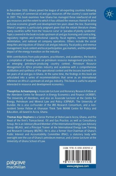 1. Introduction: Ghana's Petroleum Industry in Transition.- 2. Examining Ghana's New Exploration and Production Act and Other Legislative Developments.- 3. The Ghana-Cote-d'Ivoire Maritime Border Dispute and Transboundary Resource Management in the Gulf of Guinea.- 4. Upstream Petroleum Fiscal Regimes: Is Ghana's Tax Regime Fit for Purpose?.- 5. The Petroleum Commission and Management of Ghana's Petroleum Resources.- 6. The Ghana National Petroleum Corporation (GNPC) and its Contribution as a National Oil Company.- 7. Social Equity and Conflicts in the Six Coastal Communities of the Western Region of Ghana.- 8. Local Content and Local Participation in Ghana's Oil and Gas Industry: Has Ghana Gotten It Right?.- 9. Fiscal Policy and Petroleum Revenue Management: Is Ghana on the Path to Beating the Resource Curse?.- 10. Oil and Socio-Urban Economic Development in the Western Region.- 11. The State, Governance and the Upstream Oil and Gas Industry in Ghana.- 12. Public Interest Organisations, Transparency Initiatives and Petroleum Sector Oversight and Accountability.- 13. Utilising Ghana's Gas Resources: Implications for Industrial Development and Inclusive Growth.- 14. The Energy Transition and Africa's Oil and Gas Resources: Opportunities and Challenges.- 15. Petroleum Resource Management Lessons from New African and Other Petroleum-Producing Countries.- 16. Conclusion: The Future of Africa's Petroleum Industry.