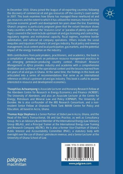 1. Introduction: Ghana's Petroleum Industry in Transition.- 2. Examining Ghana's New Exploration and Production Act and Other Legislative Developments.- 3. The Ghana-Cote-d'Ivoire Maritime Border Dispute and Transboundary Resource Management in the Gulf of Guinea.- 4. Upstream Petroleum Fiscal Regimes: Is Ghana's Tax Regime Fit for Purpose?.- 5. The Petroleum Commission and Management of Ghana's Petroleum Resources.- 6. The Ghana National Petroleum Corporation (GNPC) and its Contribution as a National Oil Company.- 7. Social Equity and Conflicts in the Six Coastal Communities of the Western Region of Ghana.- 8. Local Content and Local Participation in Ghana's Oil and Gas Industry: Has Ghana Gotten It Right?.- 9. Fiscal Policy and Petroleum Revenue Management: Is Ghana on the Path to Beating the Resource Curse?.- 10. Oil and Socio-Urban Economic Development in the Western Region.- 11. The State, Governance and the Upstream Oil and Gas Industry in Ghana.- 12. Public Interest Organisations, Transparency Initiatives and Petroleum Sector Oversight and Accountability.- 13. Utilising Ghana's Gas Resources: Implications for Industrial Development and Inclusive Growth.- 14. The Energy Transition and Africa's Oil and Gas Resources: Opportunities and Challenges.- 15. Petroleum Resource Management Lessons from New African and Other Petroleum-Producing Countries.- 16. Conclusion: The Future of Africa's Petroleum Industry.