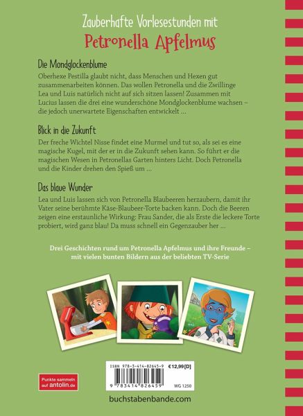 Petronella Apfelmus - Die TV-Serie: Zauberhafte Vorlesegeschichten zur beliebten Kindersendung!Für alle kleinen Fans der Apfelhexe: Magische Geschichten zum Vorlesen - inspiriert von der erfolgreichen KiKA-Serie "Petronella Apfelmus". Perfekt für Kinder ab 5 Jahren!- Drei lustige und liebevoll erzählte Abenteuer mit Petronella Apfelmus und ihren Freunden- Mit vielen farbenfrohen Originalbildern aus der TV-Serie - für ein echtes Fernseherlebnis beim Vorlesen- Kurze, abgeschlossene Geschichten - ideal für Kinder ab 5 Jahren, mit viel Magie, Witz und HerzDie MondglockenblumeOberhexe Pestilla glaubt nicht, dass Menschen und Hexen gut zusammenarbeiten können. Das wollen Petronella und die Zwillinge Lea und Luis natürlich nicht auf sich sitzen lassen! Zusammen mit Lucius lassen die drei eine wunderschöne Mondglockenblume wachsen - die jedoch unerwartete Eigenschaften entwickelt ...Blick in die ZukunftDer freche Wichtel Nisse findet eine Murmel und tut so, als sei es eine magische Kugel, mit der er in die Zukunft sehen kann. So führt er die magischen Wesen in Petronellas Garten hinters Licht. Doch Petronella und die Kinder drehen den Spieß um ...Das blaue WunderLea und Luis lassen sich von Petronella Blaubeeren herzaubern, damit ihr Vater seine berühmte Käse-Blaubeer-Torte backen kann. Doch die Beeren zeigen eine erstaunliche Wirkung: Frau Sander, die als Erste die leckere Torte probiert, wird ganz blau! Da muss schnell ein Gegenzauber her ...Gelistet bei Antolin