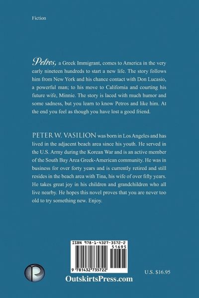 Petros, a Greek Immigrant, comes to America in the very early nineteen hundreds to start a new life. The story follows him from New York and his chance contact with Don Lucasio, a powerful man; to his move to California and courting his future wife, Minnie. The story is laced with much humor and some sadness, but you learn to know Petros and like him. At the end you feel as though you have lost a good friend. The novel encompasses the changing tides in the American social climate as well as the assimilation of the Greek peoples into American society.