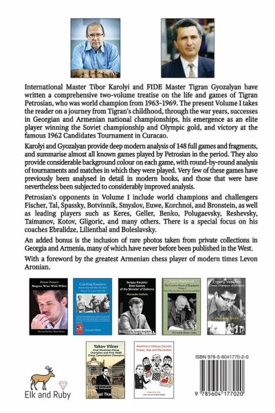 International Master Tibor Karolyi and FIDE Master Tigran Gyozalyan have written a comprehensive two-volume treatise on the life and games of Tigran Petrosian, who was world champion from 1963-1969. The present Volume I takes the reader on a journey from Tigran's childhood, through the war years, successes in Georgian and Armenian national championships, his emergence as an elite player winning the Soviet championship and Olympic gold, and victory at the famous 1962 Candidates Tournament in Curacao. Karolyi and Gyozalyan provide deep modern analysis of 148 full games and fragments, and summarise almost all known games played by Petrosian in the period. They also provide considerable background colour on each game, with round-by-round analysis of tournaments and matches in which they were played. Very few of these games have previously been analysed in detail in modern books, and those that were have nevertheless been subjected to considerably improved analysis. Petrosian's opponents in Volume I include world champions and challengers Fischer, Tal, Spassky, Botvinnik, Smyslov, Euwe, Korchnoi, and Bronstein, as well as leading players such as Keres, Geller, Benko, Polugaevsky, Reshevsky, Taimanov, Kotov, Gligoric, and many others. There is a special focus on his coaches Ebralidze, Lilienthal and Boleslavsky. An added bonus is the inclusion of rare photos taken from private collections in Georgia and Armenia, many of which have never before been published in the West. With a foreword by the greatest Armenian chess player of modern times Levon Aronian. Check out the publisher's website for special deals on this and other books!