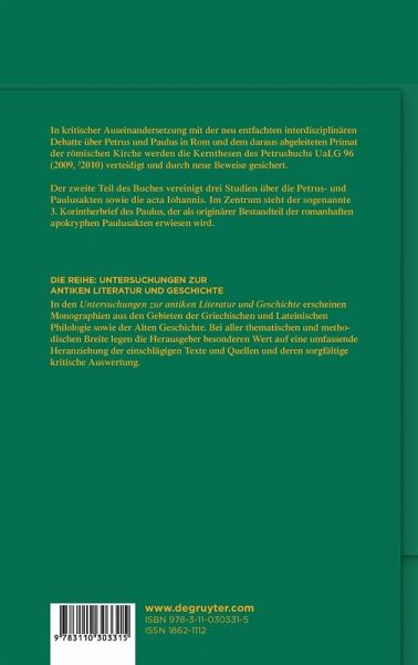 In Abwehr des Grundtenors zweier Kongreßakten (2010/2011) werden mit Blick auf 'Zwierlein, Petrus in Rom' (2009, 22010) u. a. die folgenden Thesen gesichert: 1. Petrus war niemals in Rom. 2. Petrus und Paulus sind nicht in der Neronischen Christenverfolgung gestorben; sie sind nicht Blutzeugen, sondern Dulder; nicht Begründer des römischen Episkopats (und einer auf Rom fixierten successio Apostolorum), sondern im Kampf gegen die Gnosis für Rom in Anspruch genommene Repräsentanten der Orthodoxie. 3. Die Briefe 1Petr (um 112-115) und 1Clem (um 120-125) haben keine Kenntnis von einem Aufenthalt des Petrus in Rom und von einem Martyrium der beiden Apostel Petrus und Paulus. 4. Der fiktive Petrus von 1Petr schreibt nicht in Rom, sondern in Jerusalem; "Babylon" ist keine geographische, sondern eine ontologische Metapher. 5. Dionys von Korinth berichtet um 170/174 erstmals von einer gemeinsamen Lehrtätigkeit des Petrus und Paulus, nicht von deren Martyrium. 6. Ignatius von Antiochien fingiert erst um 180 die Anwesenheit des Petrus und Paulus in Rom. 7. Der Mythos "Petrus in Rom" entsteht gemäß den schriftlichen Quellen um 150/154-170/174, nach den archäologischen Zeugnissen (Errichtung der Memoria) um 160-180. 8. Im 2. Timotheusbrief (um 150?) liegt kein originäres Wissen über den Tod des Paulus vor: es werden die Situationen seiner Gefangenschaft gemäß Phil und Apg romanhaft weitergesponnen.