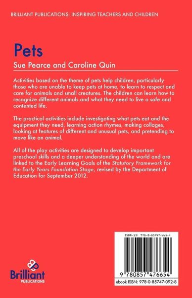 Activities based on the theme of pets help children, particularly those who are unable to keep pets at home, to learn to respect and care for animals and small creatures. The children can learn how to recognize different animals and what they need to live a safe and contented life. The practical activities include investigating what pets eat and the equipment they need, learning action rhymes, making collages, looking at features of different and unusual pets, and pretending to move like an animal. All of the play activities are designed to develop important preschool skills and a deeper understanding of the world and are linked to the Early Learning Goals of the Statutory Framework for the Early Years Foundation Stage, revised by the Department of Education for September 2012.