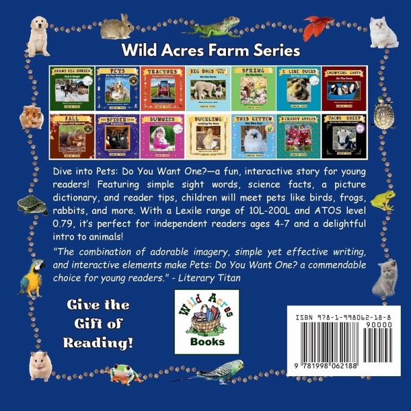 Immerse your child in a fun, interactive learning adventure with Pets: Do You Want One? This delightful story captivates young readers with colorful photos and graphics. Featuring easy, repetitive sight words, pet care tips, a picture dictionary, and helpful reader guidelines, it offers a rich educational experience. Children will explore a variety of pets, including birds, frogs, rabbits, lizards, turtles, hamsters, fish, cats, and dogs! With a Lexile range of 10L-200L and an ATOS level of 0.79, this book is perfect for independent readers ages 4-7. Whether learning to read or enjoying a read-aloud, kids will love discovering this vibrant world of animals! "The combination of adorable imagery, simple yet effective writing, and interactive elements make Pets: Do You Want One? a commendable choice for young readers." - Literary Titan