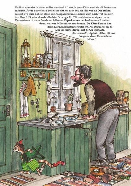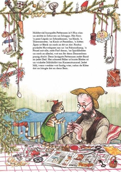 Pettersson un Kåter Findus hemm' dat mit denn Wihnachtsputz ielig. Allens is vörbereid't, bloots üm denn Bom un dat Wihnachtsäten möten sei sik noch kümmern. Jüst in dissen Momang passiert wat, wat nich passieren süll: Pettersson glitscht ut un verletzt sik so dull an'n Faut, dat hei dat nich mihr in denn Kopmannslåden schafft. Wecker sall nu all denn Leckerkråm för Wihnachten köpen? Woans kann dit Wihnachtsfest noch redd't warden? Åwer denn kümmt 'n Besäuk, mit denn har kein von de beiden räkent.Tau'n iersten Mål up Nedderdüütsch. Fründlich ünnerstütt't von dat Kompetenzzentrum för…mehr