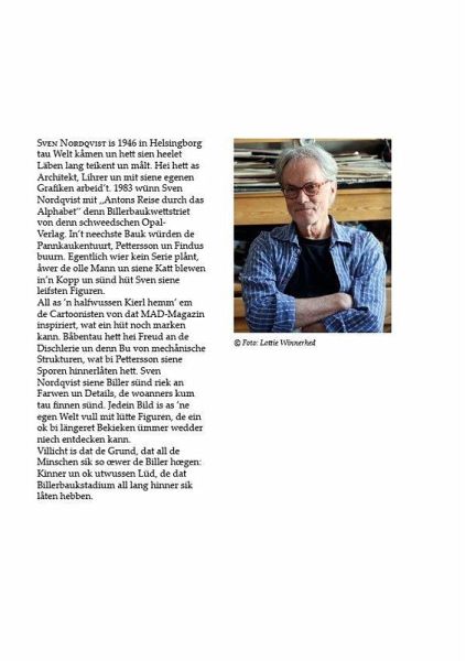 Sven Nordqvist is 1946 in Helsingborg tau Welt kåmen un hett sien heelet Läben lang teikent un målt. Hei hett as Architekt, Lihrer un mit siene egenen Grafiken arbeid't. 1983 wünn Sven Nordqvist mit "Antons Reise durch das Alphabet" denn Billerbaukwettstriet von denn schweedschen Opal-Verlag. In't neechste Bauk würden de Pannkaukentuurt, Pettersson un Findus buurn. Egentlich wier kein Serie plånt, åwer de olle Mann un siene Katt blewen in'n Kopp un sünd hüt Sven siene leifsten Figuren. All as 'n halfwussen Kierl hemm' em de Cartoonisten von dat MAD-Magazin inspiriert, wat ein hüt noch marken kann. Båbentau hett hei Freud an de Dischlerie un denn Bu von mechånische Strukturen, wat bi Pettersson siene Sporen hinnerlåten hett. Sven Nordqvist siene Biller sünd riek an Farwen un Details, de woanners kum tau finnen sünd. Jedein Bild is as 'ne egen Welt vull mit lütte Figuren, de ein ok bi längeret Bekieken ümmer wedder niech entdecken kann. Villicht is dat de Grund, dat all de Minschen sik so oewer de Biller hoegen: Kinner un ok utwussen Lüd, de dat Billerbaukstadium all lang hinner sik låten hebben. Sven Nordqvist wurde 1946 in Helsingborg geboren und hat sein ganzes Leben lang gezeichnet und gemalt. Unter anderem hat er als Architekt, Lehrer und Illustrator gearbeitet. 1983 gewann Sven Nordqvist den Bilderbuchwettbewerb des Opal-Verlags. Im nächsten Buch wurden Petterson und Findus geboren. Sven Nordqvists Bilder zeichnen sich durch eine Farb- und Detailfülle aus, die ihresgleichen sucht. Jedes Bild ist wie eine eigene Welt voller kleiner Figuren, und man kann sie lange betrachten und dabei immer wieder neue Details entdecken, die einem vorher nicht aufgefallen sind. Vielleicht ist das der Grund, warum die Bilder von allen so sehr geliebt und geschätzt werden - von kleinen Kindern ebenso wie von Erwachsenen, die das Bilderbuchalter längst hinter sich gelassen haben