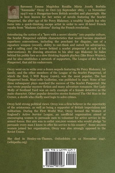Baroness Emma Magdolna Rozália Mária Jozefa Borbála "Emmuska" Orczy de Orci (23 September 1865 – 12 November 1947) was a Hungarian-born British novelist and playwright. She is best known for her series of novels featuring the Scarlet Pimpernel, the alter ego of Sir Percy Blakeney, a wealthy English fop who turns into a quick-thinking escape artist in order to save ill-fated French royalty from "Madame Guillotine" during the French revolution. Introducing the notion of a "hero with a secret identity" into popular culture, the Scarlet Pimpernel exhibits characteristics that would become standard superhero conventions, including the penchant for disguise, use of a signature weapon (sword), ability to out-think and outwit his adversaries, and a calling card (he leaves behind a scarlet pimpernel at each of his interventions). By drawing attention to his alter ego Blakeney he hides behind his public face as a slow thinking foppish playboy (like Bruce Wayne), and he also establishes a network of supporters, The League of the Scarlet Pimpernel, that aid his endeavours. Orczy went on to write over a dozen sequels featuring Sir Percy Blakeney, his family, and the other members of the League of the Scarlet Pimpernel, of which the first, I Will Repay (1906), was the most popular. The last Pimpernel book, Mam'zelle Guillotine, was published in 1940. None of her three subsequent plays matched the success of The Scarlet Pimpernel. She also wrote popular mystery fiction and many adventure romances. Her Lady Molly of Scotland Yard was an early example of a female detective as the main character. Other popular detective stories featured The Old Man in the Corner, a sleuth who chiefly used logic to solve crimes. Orczy held strong political views. Orczy was a firm believer in the superiority of the aristocracy, as well as being a supporter of British imperialism and militarism. During the First World War, Orczy formed the Women of England's Active Service League, an unofficial organisation aimed at encouraging women to persuade men to volunteer for active service in the armed forces. Her aim was to enlist 100,000 women who would pledge "to persuade every man I know to offer his service to his country". Some 20,000 women joined her organisation. Orczy was also strongly opposed to the Soviet Union. She died in Henley-on-Thames, Oxfordshire on 12 November 1947. (wikipedia.org)