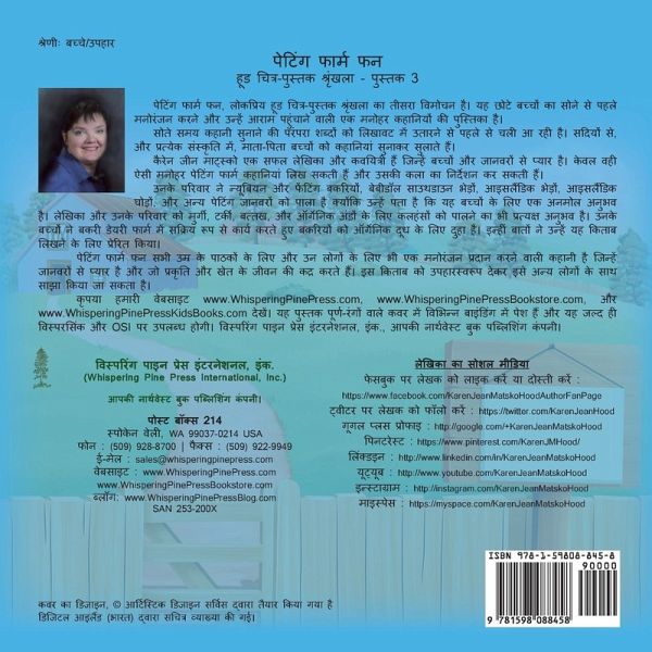 This translated edition of Petting Farm Fun is printed in Hindi. It is the third release in the popular Hood Picture Book Series. It is a delightful bedtime story to entertain and then relax young children before they fall asleep. The tradition of the bedtime story has been around since before the written word. For generations, and in every culture, parents have prepared their children for bed by telling them stories. Karen Jean Matsko Hood is a prolific author and poet that loves children and animals. It is only fitting that she would write and direct the art of this delightful petting farm story. Her family has raised Nubian goats, fainting goats, Babydoll Southdown sheep, Icelandic sheep, Icelandic horses, and other petting animals as she knows this is a valuable experience for children. The author and her family also have first hand experience raising chickens, turkeys, ducks, and geese for organic eggs. Her children have actively worked on the goat dairy farm to milk goats for organic milk. All this inspired her to write this book.