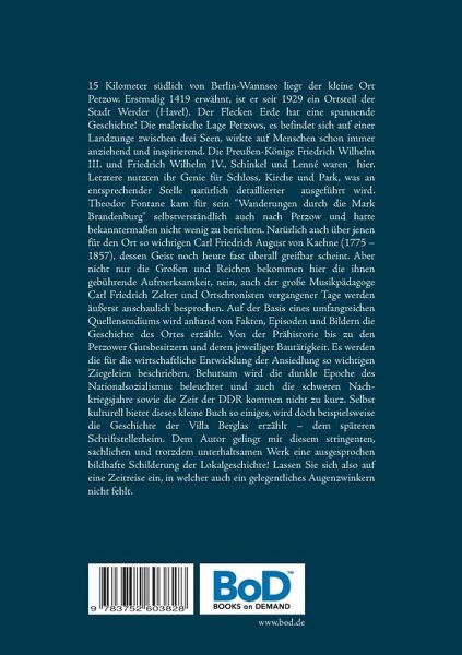15 Kilometer südlich von Berlin-Wannsee liegt der kleine Ort Petzow. Erstmalig 1419 erwähnt, seit 1929 Ortsteil von Werder (Havel), hat er eine spannende Geschichte. Die einzigartige Lage Petzows, auf einer Landzunge zwischen drei Seen, war schon immer anziehend. Preußen-König Friedrich Wilhelm IV., Schinkel und Lenné waren hier. Fontane zog es nach Petzow und er hatte viel zu berichten. Der Musikpädagoge Carl Friedrich Zelter verbrachte hier Kindheitsjahre. Gutsherr Carl Friedrich August von Kaehne hat sich um das Dorf verdient gemacht. Er schuf ab ca. 1820 das einzigartige dörfliche Ensemble mit dem neogotischen Schloss im Mittelpunkt. Den Park schuf Lenné, Schinkels Ideen halfen beim Schloss, er entwarf auch die Kirche. Anhand zahlreicher Fakten, Episoden, Bilder wird die Geschichte des Ortes erzählt. Von den Frühansiedlungen über die Petzower Gutsbesitzer, die Ziegeleien, die historische Ortsbebauung bis zu den schweren Zeiten während des Nationalsozialismus und der Nachkriegsordnung. Petzow in der DDR-Landwirtschaft, die Zerstörung historischer Gebäude und ihr Wiederaufbau, das Schicksal von Schriftstellerheim und Villa Berglas und das Schicksal vieler einzeln benannter Menschen, auf deren Lebensweg einmal Petzow lag: Über das und noch vieles mehr berichtet dieser einzigartige historische Überblick.