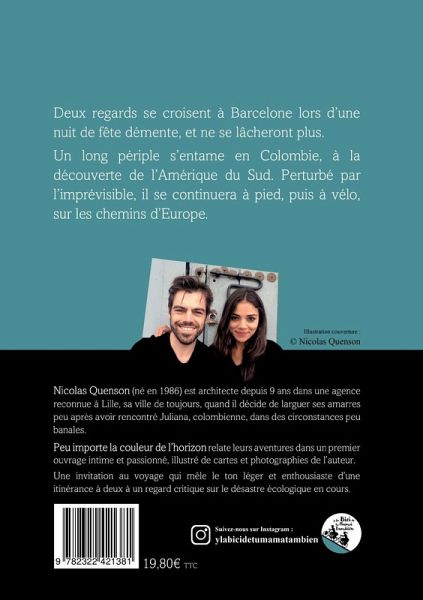 Deux regards se croisent à Barcelone lors d'une nuit de fête démente, et ne se lâcheront plus.Un long périple s'entame en Colombie, à la découverte de l'Amérique du Sud.Perturbé par l'imprévisible, il se continuera à pied, puis à vélo, sur les chemins d''Europe."Peu importe la couleur de l'horizon" relate les aventures du couple dans un premier ouvrage intime et passionné illustré de cartes et photographies.Ce livre est une invitation au voyage qui mêle le ton léger d'une itinérance à deux à un manifeste pour une profonde remise en question de notre mode de vie, face à un certain déni du désastre écologique en cours.