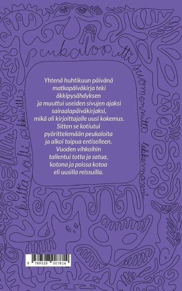 Ensin oli matkapäiväkirja, josta tulikin sairaalapäiväkirja pienen vammautumisen vuoksi. Sairaalamaailmaan tutustumisen jälkeen kirjoittaja toipui kotona seuranaan mies, kissa, koira ja vihkot sekä muut harrastusvälineet. Harrastukset antoivat puhtia ja motivaatiota käden kuntouttamiseen ja auttoivat unohtamaan säälittävän peukalo keskellä kintasta -olon. Vuoden päiväkirjoihin mahtui monta reissua ja pari satuakin.