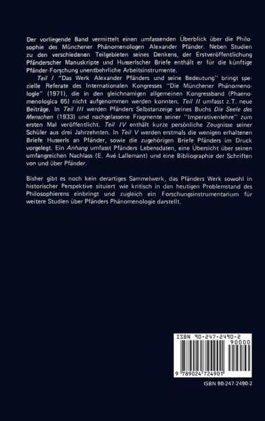 Die Idee eines selbständigen Bandes von "Pfander-Studien" entstand nach dem Internationalen Kongreß "Die Münchener Phänomenologie", der an läßlich des hundertsten Geburtstags von Alexander Pfander in München stattfand. Ursprünglich war geplant, die im zweiten Teil des Kongresses im Rahmen einer Arbeitstagung über "Das Werk und die Bedeutung Alexander pfänders" gehaltenen Referate, die bereits vervielfältigt waren, nebst Diskussionsberichten in den vorgesehenen Gesamtband über die Konferenz für die Serie Phaenomenologica einzuschlie ßen. Als sich herausstellte, daß der dort verfügbare Raum -für die meisten Beiträge zu knapp bemessen war und nur die abgekürz ten Texte ohne Diskussion hätten aufgenommen werden' können, tauchte die Idee eines gesonderten Bandes auf. Sie führte alsbald zur Erwägung neuer Beiträge und sonstiger Hilfen für das Ver ständnis des alten und neuen Werkes Pfänders. Von den Kon greßbeiträgen war ohnehin der von Karl Schuhmann ftir ein gesondertes selbständigesBuch" Husserl über Pfänder" vorgese hen, das inzwischen in der Reihe Phaenomenologica erschienen ist. 1 Der Beitrag von Peter Schwankl "Alexander pfänders Nachlaßtexte über das virtuell Psychische" erschien im Journal 0/ Phenomenological Psychology. 2 Die beiden einleitenden Refe rate von Schwankl und Spiegel berg über die damals noch unge druckten Nachlaßwerke Philosophie auf phänomenologischer Grundlage und Ethik in kurzer Darstellung konnten nach deren Erscheinen fortbleiben.