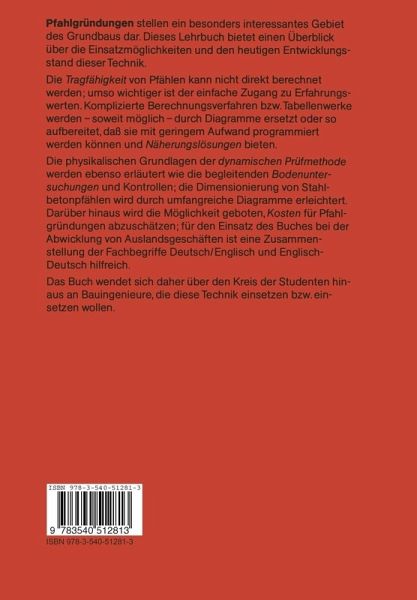 Das Thema ist besonders interessant für die Problemstellungen des Grundbaus. Die Tragfähigkeit von Pfählen kann nicht direkt berechnet werden; um so wichtiger ist der einfache Zugang zu Erfahrungswerten. In diesem Buch werden komplizierte Berechnungsverfahren und Tabellenwerte - soweit möglich - durch Diagramme ersetzt oder so aufbereitet, daß sie mit geringem Aufwand programmiert werden können und Näherungslösungen bieten. Die physikalischen Grundlagen der dynamischen Prüfmethode werden ebenso erläutert wie die begleitenden Bodenuntersuchungen und Kontrollen; die Dimensionierung von Stahlbetonpfählen wird durch umfangreiche Diagramme erleichtert. Darüberhinaus wird die Möglichkeit geboten, anhand von unverbindlichen Preisbeispielen Kosten für Pfahlgründungen abzuschätzen; für den Einsatz des Buches bei der Abwicklung von Auslandsaufträgen ist eine Zusammenstellung der Fachbegriffe Deutsch/Englisch/Deutsch hilfreich. Das Buch wendet sich daher über den Kreis der Studenten hinaus an Bauingenieure, die diese Technik einsetzen bzw. einsetzen wollen.
