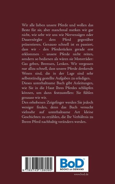 Wir alle lieben unsere Pferde und wollen das Beste für sie, aber manchmal merken wir gar nicht, wie sehr wir uns wie Nervensägen oder Dauernörgler dem Pferd gegenüber präsentieren. Genauso schnell ist es passiert, dass wir - den Pferderücken gerade erst erklommen - unsere Pferde nicht reiten, sondern so bedienen als wären sie Motorräder: Gas geben, Bremsen, Lenken. Wir vergessen nur allzu schnell, dass unsere Pferde denkende Wesen sind, die in der Lage sind, sehr selbstständig gestellte Aufgaben zu erledigen.Dieses unterhaltsame Buch gibt Anleitungen, wie Sie in die Haut Ihres Pferdes schlüpfen können, um dann festzustellen: Sie fühlen genauso wie wir.Den erhobenen Zeigefinger werden Sie jedoch weniger finden, denn das Buch versucht vielmehr auf unterhaltsame Art kleine Geschichten zu erzählen, die Ihr Verhältnis zu Ihrem Pferd nachhaltig verändern werden.