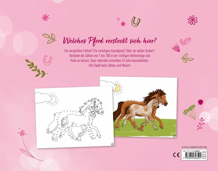 Ein verspieltes Fohlen? Ein zotteliges Islandpony? Oder ein wilder Araber? Verbinde die Zahlen von 1 bis 100 in der richtigen Reihenfolge und finde es heraus. Ganz nebenbei entstehen so 24 tolle Ausmalbilder. Viel Spaß beim Zählen und Malen!