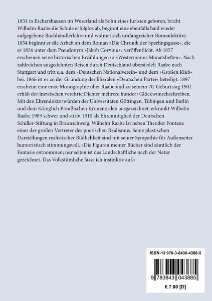 1831 in Eschershausen im Weserland als Sohn eines Juristen geboren, bricht Wilhelm Raabe die Schule erfolglos ab, beginnt eine ebenfalls bald wieder aufgegebene Buchhändlerlehre und widmet sich umfangreicher Romanlektüre. 1854 beginnt er die Arbeit an dem Roman "Die Chronik der Sperlingsgasse", die er 1856 unter dem Pseudonym "Jakob Corvinus" veröffentlicht. Ab 1857 erscheinen seine historischen Erzählungen in "Westermanns Monatsheften". Nach zahlreichen ausgedehnten Reisen durch Deutschland übersiedelt Raabe nach Stuttgart und tritt u.a. dem "Deutschen Nationalverein" und dem "Großen Klub" bei. 1866 ist er an der Gründung der liberalen "Deutschen Partei" beteiligt. 1897 erscheint eine erste Monographie über Raabe und zu seinem 70. Geburtstag 1901 erhält der inzwischen verehrte Dichter mehrere hundert Glückwunschschreiben. Mit den Ehrendoktorwürden der Universitäten Göttingen, Tübingen und Berlin und dem Königlich Preußischen Kronenorden ausgezeichnet, erkrankt Wilhelm Raabe 1909 schwer und stirbt 1910 als Ehrenmitglied der Deutschen Schiller-Stiftung in Braunschweig. Wilhelm Raabe ist neben Theodor Fontane einer der großen Vertreter des poetischen Realismus. Seine plastischen Darstellungen realistischer Bildlichkeit sind mit seiner Sympathie für Außenseiter humoristisch stimmungsvoll. "Die Figuren meiner Bücher sind sämtlich der Fantasie entnommen; nur selten ist das Landschaftliche nach der Natur gezeichnet. Das Volkstümliche fasse ich instinktiv auf."