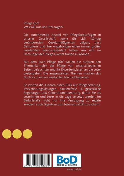 Pflege 360°Was will uns der Titel sagen?Die zunehmende Anzahl von Pflegebedürftigen in unserer Gesellschaft sowie die sich ständig verändernden Gesetzmäßigkeiten zeigen, dass Betroffene und ihre Angehörigen einen immer größer werdenden Beratungsbedarf haben, um sich im Dschungel der Pflege zurechtfinden zu können.Mit dem Buch Pflege 360° wollen die Autoren den Themenkomplex der Pflege von unterschiedlichen Seiten beleuchten und ihr Expertenwissen an die Leser weitergeben. Die ausgewählten Themen machen das Buch so zu einem wertvollen Nachschlagewerk.So werfen die Autoren einen Blick auf Pflegeberatung, Versicherungslösungen, barrierefreie IT, gesetzliche Regelungen und Generationenberatung, damit Sie als Leserinnen und Leser in die Lage versetzt werden, im Bedarfsfalle nicht nur Ihre Versorgung zu regeln, sondern auch Eigentum und Lebensqualität zu sichern.