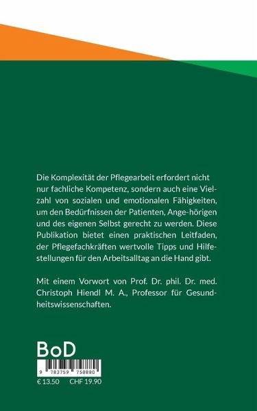 Die Komplexität der Pflegearbeit erfordert nicht nur fachliche Kompetenz, sondern auch eine Vielzahl von sozialen und emotionalen Fähigkeiten, um den Bedürfnissen der Patienten, Ange-hörigen und des eigenen Selbst gerecht zu werden. Diese Publikation bietet einen praktischen Leitfaden, der Pflegefachkräften wertvolle Tipps und Hilfestellungen für den Arbeitsalltag an die Hand gibt. Mit einem Vorwort von Prof. Dr. phil. Dr. med. Christoph Hiendl M. A., Professor für Gesundheitswissenschaften.