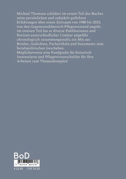 Michael Thomsen schildert im ersten Teil des Buches seine persönlichen und subjektiv gefärbten Erfahrungen über einen Zeitraum von 1988 bis 2023, was den Gegenstandsbereich Pflegenotstand angeht. Im zweiten Teil hat er diverse Publikationen und Notizen unterschiedlicher Couleur ungefähr chronologisch zusammengestellt; ein Mix aus Briefen, Gedichten, Fachartikeln und Statements zum berufspolitischen Geschehen.Möglicherweise eine Fundgrube für historisch Interessierte und Pflegewissenschaftler für Ihre Arbeiten zum Themenkomplex!