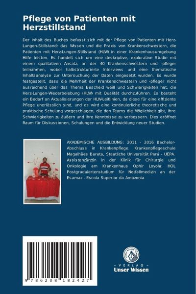 Der Inhalt des Buches befasst sich mit der Pflege von Patienten mit Herz-Lungen-Stillstand: das Wissen und die Praxis von Krankenschwestern, die Patienten mit Herz-Lungen-Stillstand (HLW) in einer Krankenhausumgebung Hilfe leisten. Es handelt sich um eine deskriptive, explorative Studie mit einem qualitativen Ansatz, an der 40 Krankenschwestern und -pfleger teilnahmen, wobei halbstrukturierte Interviews und eine thematische Inhaltsanalyse zur Untersuchung der Daten eingesetzt wurden. Es wurde festgestellt, dass die Mehrheit der Krankenschwestern und -pfleger nicht ausreichend über das Thema Bescheid weiß und Schwierigkeiten hat, die Herz-Lungen-Wiederbelebung (HLW) mit Qualität durchzuführen. Es besteht ein Bedarf an Aktualisierungen der HLW-Leitlinien, da diese für eine effiziente Pflege unerlässlich sind, und es wird eine kontinuierliche theoretische und praktische Schulung vorgeschlagen, die den Teams die Möglichkeit gibt, ihre Schwierigkeiten zu äußern und ihre Kenntnisse zu verbessern. Dies eröffnet Raum für Diskussionen, Schulungen und die Entwicklung neuer Studien.