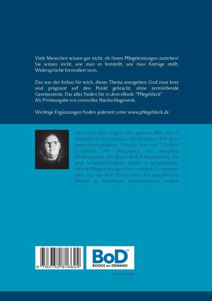 Viele Menschen wissen gar nicht, ob ihnen Pflegeleistungen zustehen! Sie wissen nicht, wie man es feststellt, wie man Anträge stellt, Widersprüche formuliert uvm.Das war der Anlass für mich, dieses Thema anzugehen: Und zwar kurz und prägnant auf den Punkt gebracht, ohne zermürbende Gesetzestexte. Das alles finden Sie in dem eBook: Pflegeblock, natürlich auch als Printausgabe immer ein sinnvolles Nachschlagewerk.Wichtige Ergänzungen finden jederzeit unter www.pflegeblock.de