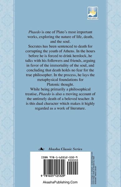 Phaedo is one of Plato's most important works, exploring the nature of life, death, and the soul. Socrates has been sentenced to death for corrupting the youth of Athens. In the hours before he is forced to drink hemlock, he talks with his followers and friends, arguing in favor of in the immortality of the soul, and concluding that death holds no fear for the true philosopher. In the process, he lays the metaphysical foundations for Platonic thought. While being primarily a philosophical treatise, Phaedo is also a moving account of the untimely death of a beloved teacher. It is this dual character which makes it highly regarded as a work of literature.