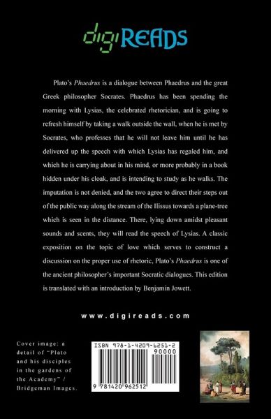 Plato’s "Phaedrus" is a dialogue between Phaedrus and the great Greek philosopher Socrates. Phaedrus has been spending the morning with Lysias, the celebrated rhetorician, and is going to refresh himself by taking a walk outside the wall, when he is met by Socrates, who professes that he will not leave him until he has delivered up the speech with which Lysias has regaled him, and which he is carrying about in his mind, or more probably in a book hidden under his cloak, and is intending to study as he walks. The imputation is not denied, and the two agree to direct their steps out of the…mehr