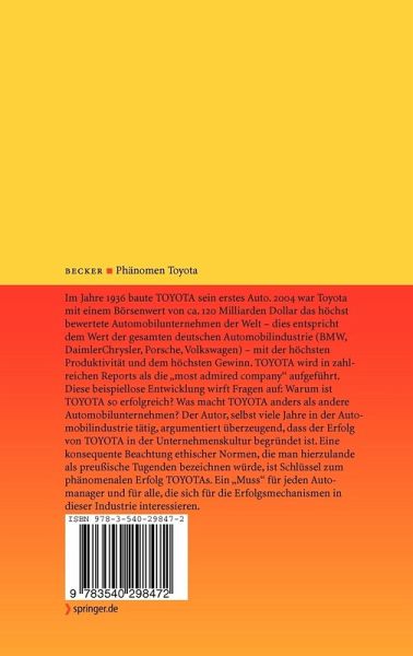 Im Jahre 1936 baute TOYOTA sein erstes Auto. 2004 war Toyota mit einem Börsenwert von ca. 120 Milliarden Dollar das höchst bewertete Automobilunternehmen der Welt - dies entspricht dem Wert der gesamten deutschen Automobilindustrie (BMW, DaimlerChrysler, Porsche, Volkswagen) - mit der höchsten Produktivität und dem höchsten Gewinn. TOYOTA wird in zahlreichen Reports als die "most admired company" aufgeführt. Diese beispiellose Entwicklung wirft Fragen auf: Warum ist TOYOTA so erfolgreich? Was macht TOYOTA anders als andere Automobilunternehmen? Der Autor, selbst viele Jahre in der Automobilindustrie tätig, argumentiert überzeugend, dass der Erfolg von TOYOTA in der Unternehmenskultur begründet ist. Eine konsequente Beachtung ethischer Normen, die man hierzulande als preußische Tugenden bezeichnen würde, ist Schlüssel zum phänomenalen Erfolg TOYOTAs. Ein "Muss" für jeden Automanager und für alle, die sich für die Erfolgsmechanismen in dieser Industrie interessieren.