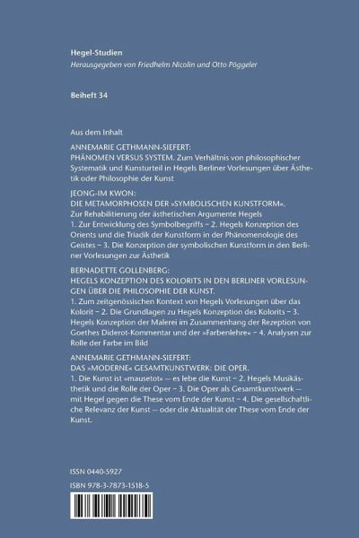 ANNEMARIE GETHMANN-SIEFERT. PHÄNOMEN VERSUS SYSTEM. Zum Verhältnis von philosophischer Systematik und Kunsturteil in Hegels Berliner Vorlesungen über Ästhetik oder Philosophie der Kunst JEONG-IM KWON. DIE METAMORPHOSEN DER »SYMBOLISCHEN KUNSTFORM«. Zur Rehabilitierung der ästhetischen Argumente Hegels 1. Zur Entwicklung des Symbolbegriffs ¿ 2. Hegels Konzeption des Orients und die Triadik der Kunstform in der Phänomenologie des Geistes ¿ 3. Die Konzeption der symbolischen Kunstform in den Berliner Vorlesungen zur Ästhetik ¿ 3.1 Die symbolische Kunstform in der Vorlesung von 1820/21 ¿ 3.2 Die symbolische Kunstform in der Vorlesung von 1823: die »substantielle Subjektivität« als Inhalt der Kunst ¿ 3.3 Die symbolische Kunstform in der Vorlesung von 1826: der »Werkcharakter der Kunst« ¿ 3.4 Die symbolische Kunstform in der Vorlesung von 1828/29: die »Menschwerdung Gottes« BERNADETTE GOLLENBERG. HEGELS KONZEPTION DES KOLORITS IN DEN BERLINER VORLESUNGEN ÜBER DIE PHILOSOPHIE DER KUNST. 1. Zum zeitgenössischen Kontext von Hegels Vorlesungen über das Kolorit ¿ 2. Die Grundlagen zu Hegels Konzeption des Kolorits ¿ 2.1 Zum Prinzip von Goethes Übersetzung und Kommentierung des Diderot-Essays ¿ 2.2 Schellings Konzeption der Farbe in der »Philosophie der Kunst« ¿ 2.3 Grundzüge der Positionen Diderots, Goethes und Schellings hinsichtlich des künstlerischen Kolorits ¿ 3. Hegels Konzeption der Malerei im Zusammenhang der Rezeption von Goethes Diderot-Kommentar und der »Farbenlehre« ¿ 3.1 Hegels Bestimmung des Ideals ¿ 3.2 Hegel und Goethe: Die Auseinandersetzung um die systematische Grundlage der Farbenlehre ¿ 3.3 Hegels Bestimmung der Farbe im Rahmen einer prinzipiellen Charakteristik der Malerei ¿ 3.4 Hegels Bestimmung des Kolorits ¿ 3.5 Hegels Vorlesungen zur Farbe im Vergleich mit der von Hotho bearbeiteten Druckfassung der »Ästhetik« ¿ 4. Analysen zur Rolle der Farbe im Bild ¿ 4.1 Hegels Überlegungen zur ¿eigentümlichen Art von Farbe¿ der Italiener in der Vorlesung von 1826 ¿ 4.2 Hegels Bestimmung der niederländischen Genremalerei ¿ 4.3 Hegel zum ¿Musikalischen der Malerei¿ ANNEMARIE GETHMANN-SIEFERT. DAS »MODERNE« GESAMTKUNSTWERK: DIE OPER. 1. Die Kunst ist »mausetot« ¿ es lebe die Kunst ¿ 1.1 Kunstbegeisterung und Philosophie der Kunst ¿ 1.2 Der Klassizismus der Hegelschen Ästhetik ¿2. Hegels Musikästhetik und die Rolle der Oper ¿ 2.1 Die Konstruktion der Hegelschen Musikästhetik ¿ 2.2 Kooperation und Konkurrenz in der Bestimmung der Oper ¿ 3. Die Oper als Gesamtkunstwerk ¿ mit Hegel gegen die These vom Ende der Kunst ¿ 3.1 Die Bedeutungsvariation der Kunst in der modernen Welt ¿ 3.2 Die »wahre Sittlichkeit« ¿ das Schöne und das Erhabene ¿ 4. Die gesellschaftliche Relevanz der Kunst ¿ oder die Aktualität der These vom Ende der Kunst Namensregister ¿ Sachregister