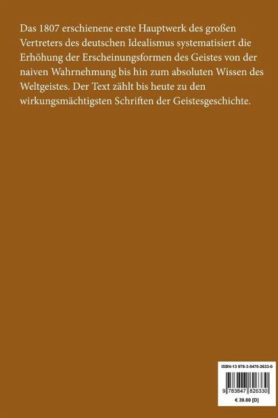 Georg Wilhelm Friedrich Hegel: Phänomenologie des Geistes Lesefreundlicher Großdruck in 16-pt-Schrift Das 1807 erschienene erste Hauptwerk des großen Vertreters des deutschen Idealismus systematisiert die Erhöhung der Erscheinungsformen des Geistes von der naiven Wahrnehmung bis hin zum absoluten Wissen des Weltgeistes. Der Text zählt bis heute zu den wirkungsmächtigsten Schriften der Geistesgeschichte. Großformat, 210 x 297 mm Berliner Ausgabe, 2019 Durchgesehener Neusatz mit einer Biographie des Autors bearbeitet und eingerichtet von Theodor Borken Erstdruck: Bamberg und Würzburg (Goebhardt) 1807. Der Text folgt bis S. 35 der von Hegel kurz vor seinem Tod begonnenen Revision. Textgrundlage ist die Ausgabe: Georg Wilhelm Friedrich Hegel: Werke. Auf der Grundlage der Werke von 1832-1845 neu edierte Ausgabe. Redaktion Eva Moldenhauer und Karl Markus Michel, Frankfurt a. M.: Suhrkamp, 1979 (Theorie-Werkausgabe). Umschlaggestaltung von Thomas Schultz-Overhage unter Verwendung des Bildes: Georg Wilhelm Friedrich Hegel, porträtiert von Jakob Schlesinger, 1831. Gesetzt aus der Minion Pro, 16 pt.