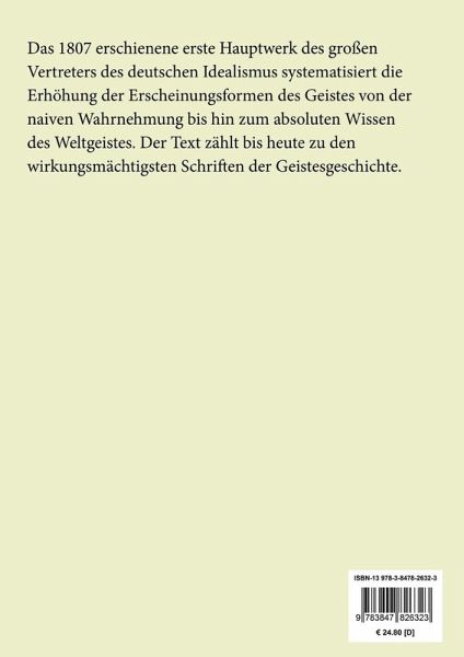 Georg Wilhelm Friedrich Hegel: Phänomenologie des Geistes Lesefreundlicher Großdruck in 16-pt-Schrift Das 1807 erschienene erste Hauptwerk des großen Vertreters des deutschen Idealismus systematisiert die Erhöhung der Erscheinungsformen des Geistes von der naiven Wahrnehmung bis hin zum absoluten Wissen des Weltgeistes. Der Text zählt bis heute zu den wirkungsmächtigsten Schriften der Geistesgeschichte. Großformat, 210 x 297 mm Berliner Ausgabe, 2019 Durchgesehener Neusatz mit einer Biographie des Autors bearbeitet und eingerichtet von Theodor Borken Erstdruck: Bamberg und Würzburg (Goebhardt) 1807. Der Text folgt bis S. 35 der von Hegel kurz vor seinem Tod begonnenen Revision. Textgrundlage ist die Ausgabe: Georg Wilhelm Friedrich Hegel: Werke. Auf der Grundlage der Werke von 1832-1845 neu edierte Ausgabe. Redaktion Eva Moldenhauer und Karl Markus Michel, Frankfurt a. M.: Suhrkamp, 1979 (Theorie-Werkausgabe). Umschlaggestaltung von Thomas Schultz-Overhage unter Verwendung des Bildes: Georg Wilhelm Friedrich Hegel, porträtiert von Jakob Schlesinger, 1831. Gesetzt aus der Minion Pro, 16 pt. Henricus Edition Deutsche Klassik UG (haftungsbeschränkt)