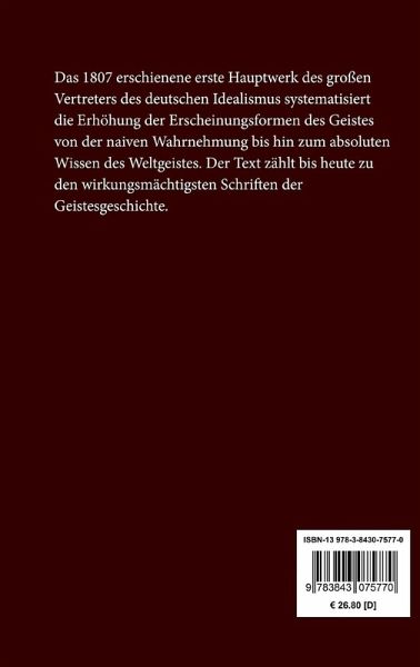 Georg Wilhelm Friedrich Hegel: Phänomenologie des Geistes Das 1807 erschienene erste Hauptwerk des großen Vertreters des deutschen Idealismus systematisiert die Erhöhung der Erscheinungsformen des Geistes von der naiven Wahrnehmung bis hin zum absoluten Wissen des Weltgeistes. Der Text zählt bis heute zu den wirkungsmächtigsten Schriften der Geistesgeschichte. Erstdruck: Bamberg und Würzburg (Goebhardt) 1807. Der Text folgt bis S. 35 der von Hegel kurz vor seinem Tod begonnenen Revision. Vollständige Neuausgabe mit einer Biographie des Autors. Herausgegeben von Karl-Maria Guth. Berlin 2015. Textgrundlage ist die Ausgabe: Georg Wilhelm Friedrich Hegel: Werke. Auf der Grundlage der Werke von 1832-1845 neu edierte Ausgabe. Redaktion Eva Moldenhauer und Karl Markus Michel, Frankfurt a. M.: Suhrkamp, 1979 (Theorie-Werkausgabe). Die Paginierung obiger Ausgabe wird in dieser Neuausgabe als Marginalie zeilengenau mitgeführt. Umschlaggestaltung von Thomas Schultz-Overhage unter Verwendung des Bildes: Georg Wilhelm Friedrich Hegel, porträtiert von Jakob Schlesinger, 1831. Gesetzt aus Minion Pro, 11 pt.