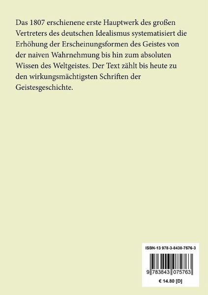Georg Wilhelm Friedrich Hegel: Phänomenologie des Geistes Das 1807 erschienene erste Hauptwerk des großen Vertreters des deutschen Idealismus systematisiert die Erhöhung der Erscheinungsformen des Geistes von der naiven Wahrnehmung bis hin zum absoluten Wissen des Weltgeistes. Der Text zählt bis heute zu den wirkungsmächtigsten Schriften der Geistesgeschichte. Erstdruck: Bamberg und Würzburg (Goebhardt) 1807. Der Text folgt bis S. 35 der von Hegel kurz vor seinem Tod begonnenen Revision. Vollständige Neuausgabe mit einer Biographie des Autors. Herausgegeben von Karl-Maria Guth. Berlin 2015. Textgrundlage ist die Ausgabe: Georg Wilhelm Friedrich Hegel: Werke. Auf der Grundlage der Werke von 1832-1845 neu edierte Ausgabe. Redaktion Eva Moldenhauer und Karl Markus Michel, Frankfurt a. M.: Suhrkamp, 1979 (Theorie-Werkausgabe). Die Paginierung obiger Ausgabe wird in dieser Neuausgabe als Marginalie zeilengenau mitgeführt. Umschlaggestaltung von Thomas Schultz-Overhage unter Verwendung des Bildes: Georg Wilhelm Friedrich Hegel, porträtiert von Jakob Schlesinger, 1831. Gesetzt aus Minion Pro, 11 pt.