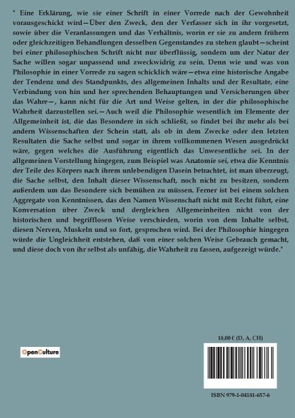 " Eine Erklärung, wie sie einer Schrift in einer Vorrede nach der Gewohnheit vorausgeschickt wird¿Über den Zweck, den der Verfasser sich in ihr vorgesetzt, sowie über die Veranlassungen und das Verhältnis, worin er sie zu andern frühern oder gleichzeitigen Behandlungen desselben Gegenstandes zu stehen glaubt¿scheint bei einer philosophischen Schrift nicht nur überflüssig, sondern um der Natur der Sache willen sogar unpassend und zweckwidrig zu sein. Denn wie und was von Philosophie in einer Vorrede zu sagen schicklich wäre¿etwa eine historische Angabe der Tendenz und des Standpunkts, des allgemeinen Inhalts und der Resultate, eine Verbindung von hin und her sprechenden Behauptungen und Versicherungen über das Wahre¿, kann nicht für die Art und Weise gelten, in der die philosophische Wahrheit darzustellen sei.¿Auch weil die Philosophie wesentlich im Elemente der Allgemeinheit ist, die das Besondere in sich schließt, so findet bei ihr mehr als bei andern Wissenschaften der Schein statt, als ob in dem Zwecke oder den letzten Resultaten die Sache selbst und sogar in ihrem vollkommenen Wesen ausgedrückt wäre, gegen welches die Ausführung eigentlich das Unwesentliche sei. In der allgemeinen Vorstellung hingegen, zum Beispiel was Anatomie sei, etwa die Kenntnis der Teile des Körpers nach ihrem unlebendigen Dasein betrachtet, ist man überzeugt, die Sache selbst, den Inhalt dieser Wissenschaft, noch nicht zu besitzen, sondern außerdem um das Besondere sich bemühen zu müssen. Ferner ist bei einem solchen Aggregate von Kenntnissen, das den Namen Wissenschaft nicht mit Recht führt, eine Konversation über Zweck und dergleichen Allgemeinheiten nicht von der historischen und begrifflosen Weise verschieden, worin von dem Inhalte selbst, diesen Nerven, Muskeln und so fort, gesprochen wird. Bei der Philosophie hingegen würde die Ungleichheit entstehen, daß von einer solchen Weise Gebrauch gemacht, und diese doch von ihr selbst als unfähig, die Wahrheit zu fassen, aufgezeigt würde."