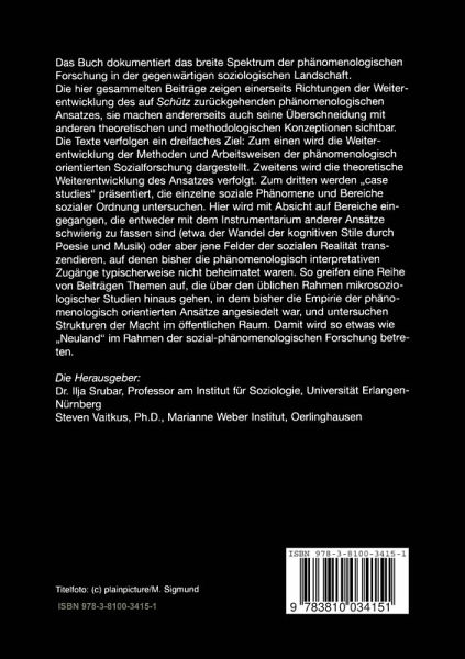 Der Band dokumentiert das breite Spektrum der phänomenologischen Forschung in der gegenwärtigen soziologischen Landschaft. Er präsentiert die Weiterentwicklung des phänomenologischen Ansatzes in den Bereichen der Theorie, der Methoden sowie der empirischen Untersuchungen.