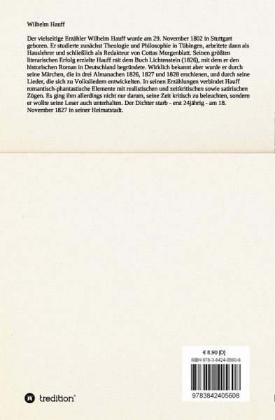 Der vielseitige Erzähler Wilhelm Hauff wurde am 29. November 1802 in Stuttgart geboren. Er studierte zunächst Theologie und Philosophie in Tübingen, arbeitete dann als Hauslehrer und schließlich als Redakteur von CottasMorgenblatt. Seinen größten literarischen Erfolg erzielte Hauff mit dem BuchLichtenstein(1826), mit dem er den historischen Roman in Deutschland begründete. Wirklich bekannt aber wurde er durch seine Märchen, die in drei Almanachen 1826, 1827 und 1828 erschienen, und durch seine Lieder, die sich zu Volksliedern entwickelten. In seinen Erzählungen verbindet Hauff romantisch-phantastische Elemente mit realistischen und zeitkritischen sowie satirischen Zügen. Es ging ihm allerdings nicht nur darum, seine Zeit kritisch zu beleuchten, sondern er wollte seine Leser auch unterhalten. Der Dichter starb - erst 24jährig - am 18. November 1827 in seiner Heimatstadt.